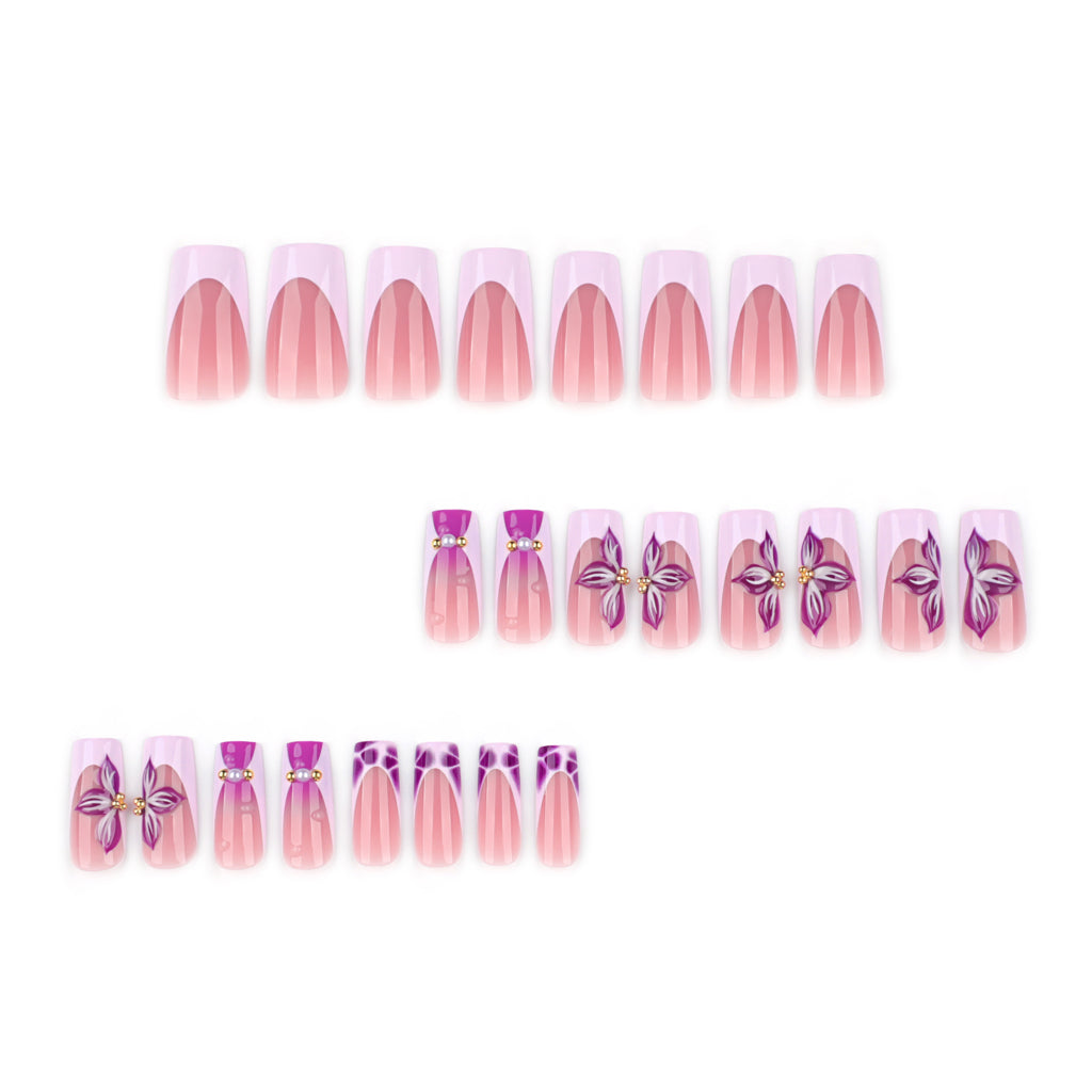Bold Pink & Purple Floral DesignThese long square press on nails feature a vibrant pink base with hand-painted purple flowers, gold accents, and pearls, a top bold & trendy style in the US beauty market.